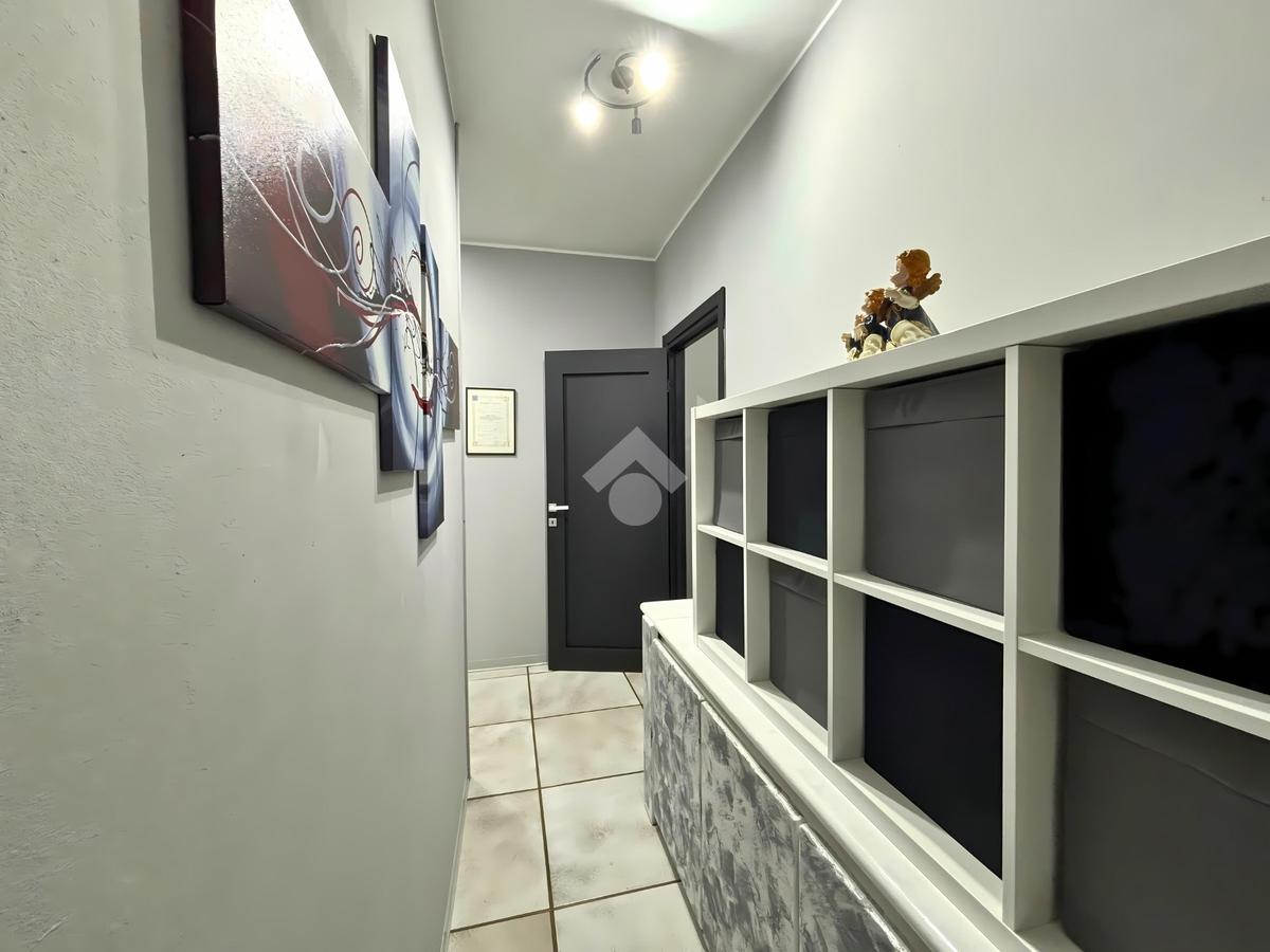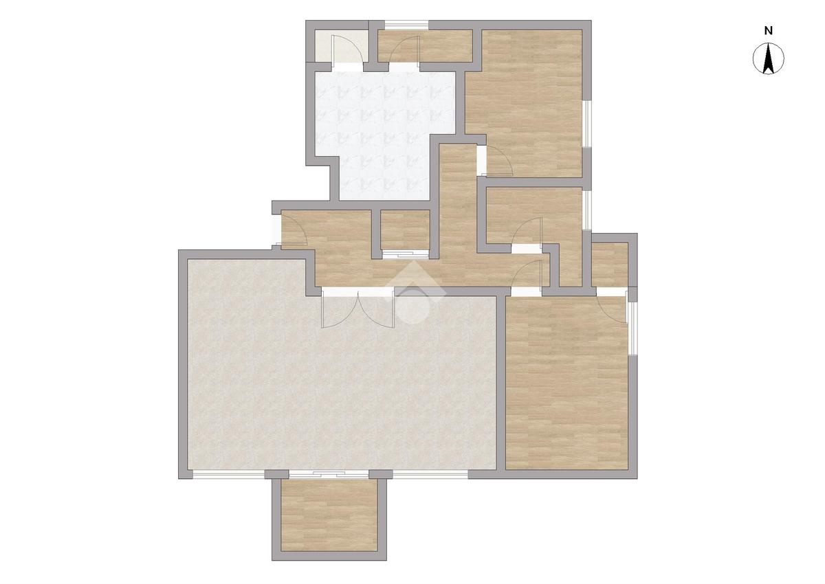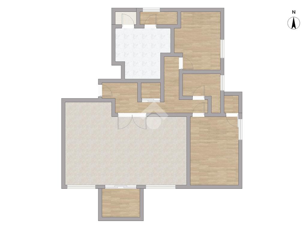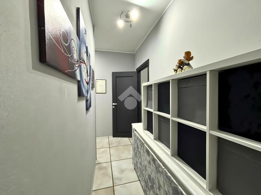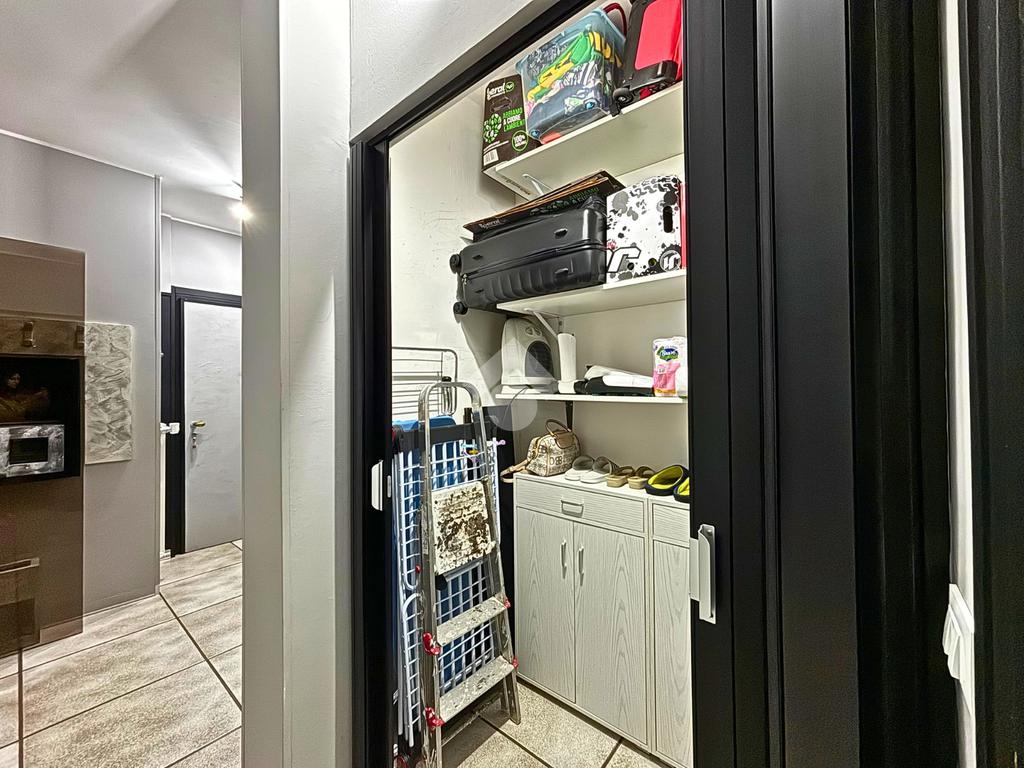 Il soggiorno, separato e organizzato per ospitare sia la zona relax sia l’area pranzo, si apre su un terrazzo vivibile e coperto, perfetto per momenti di convivialità o di relax all’aperto. Il corriodio porta anche a un comodo ripostiglio e al servizio finestrato, dotato di vasca e grande box doccia. Dal medesimo disimpegno si accede anche a due camere da letto, entrambe di generose dimensioni e una delle quali con affaccio su balcone.