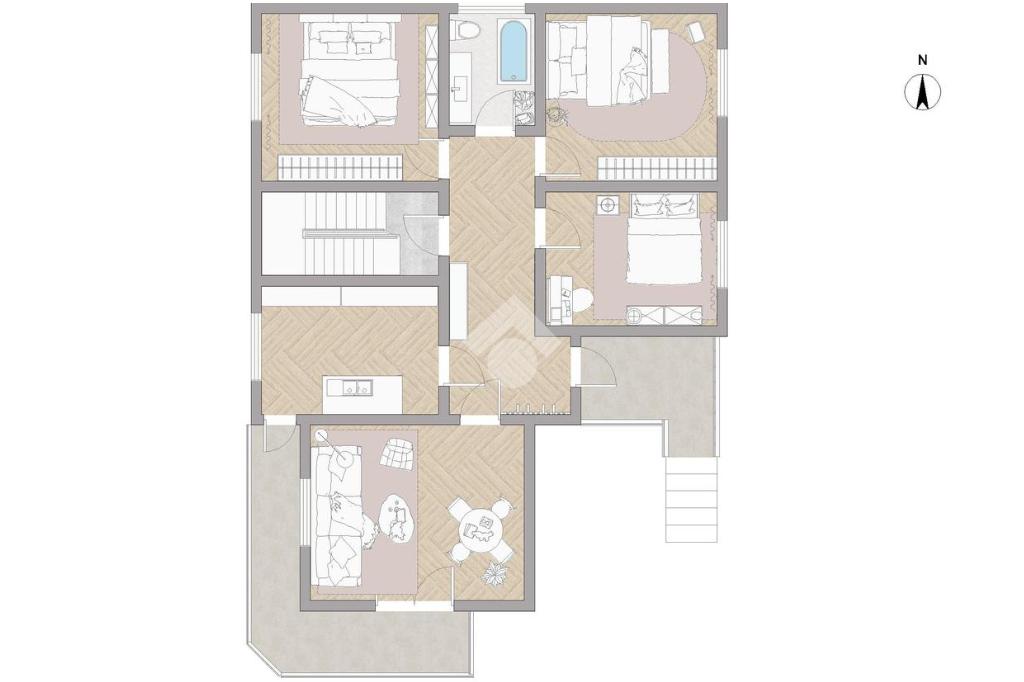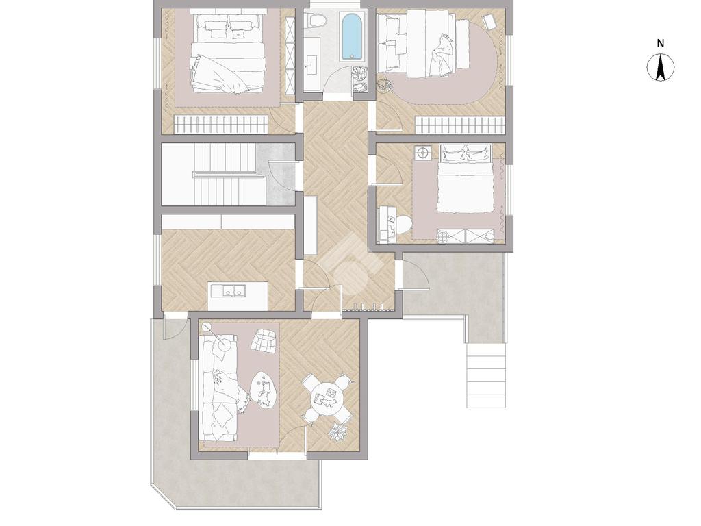 Il piano rialzato è organizzato in modo razionale e funzionale: la zona giorno, composta da soggiorno e cucina separata e abitabile, entrambi con accesso al balcone, è ben distinta dalla zona notte, alla quale si accede tramite un ampio corridoio centrale che garantisce privacy e facilità di arredo.