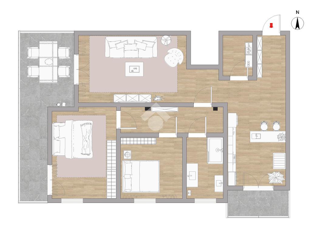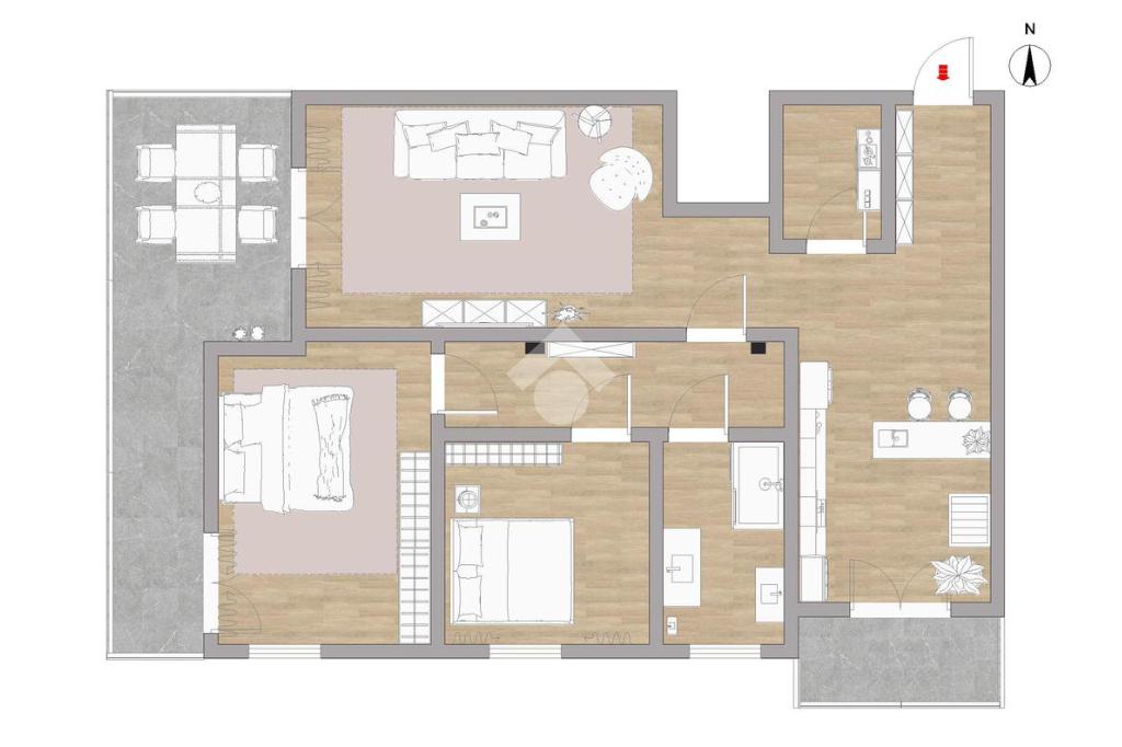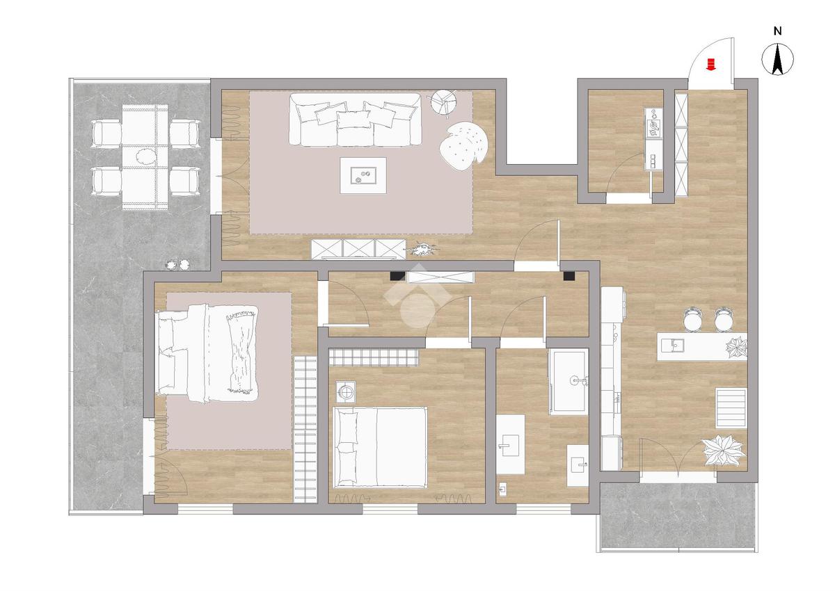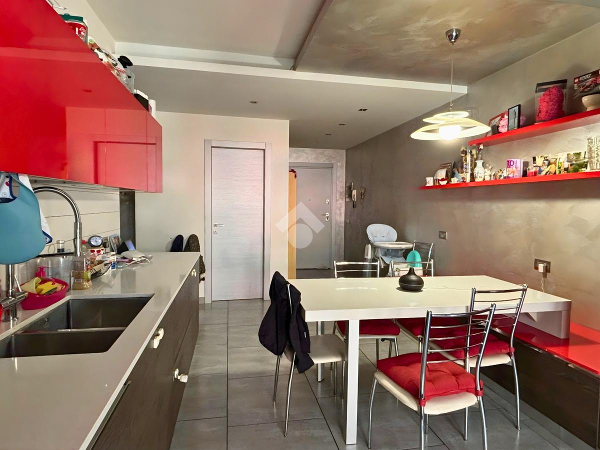 L’appartamento è caratterizzato da una zona giorno luminosa con cucina e soggiorno collegati a due spazi esterni: uno direttamente dalla cucina e un grande terrazzino accessibile sia dal soggiorno che dalla camera padronale, ideale per pranzi all’aperto o momenti di relax.