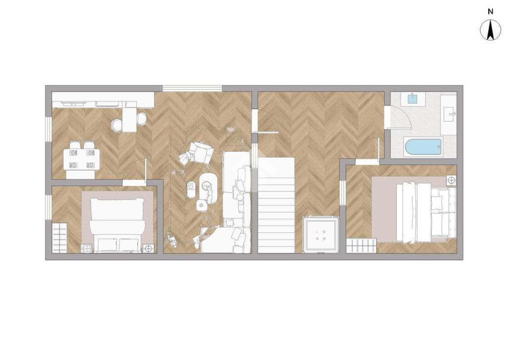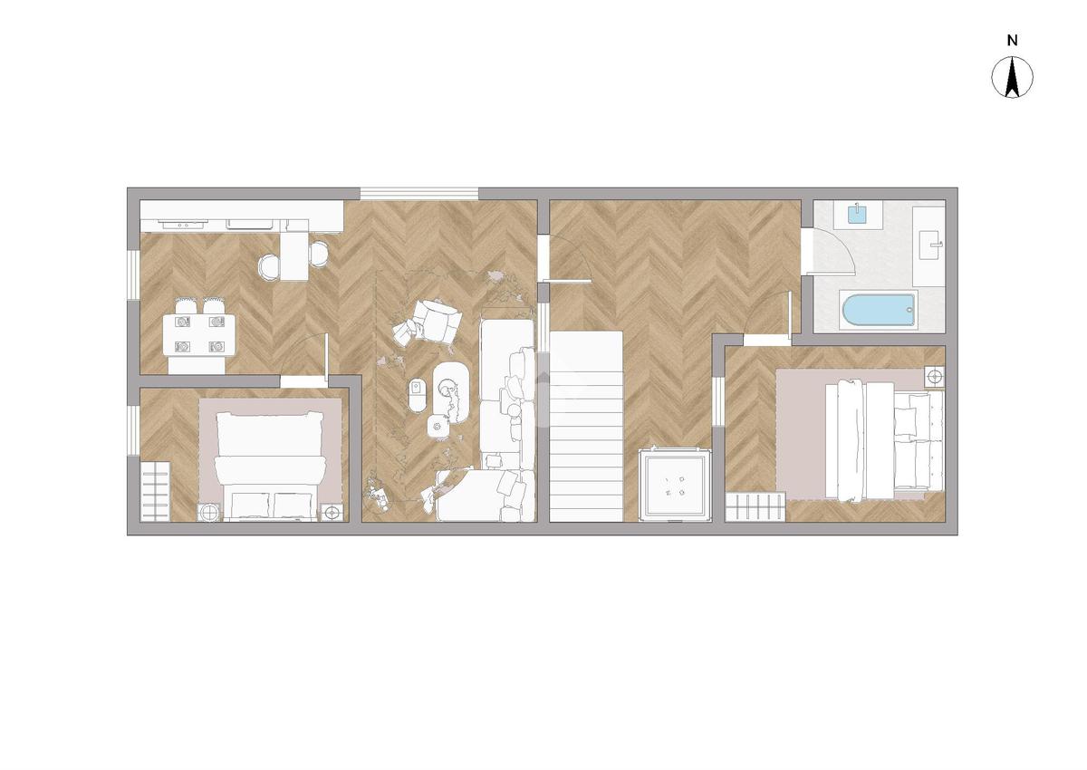 Salendo al piano superiore si sviluppa la zona giorno, ampia e luminosa, caratterizzata dalla bella divisione tra la zona living e l'angolo cottura, sempre a vista e angolare.