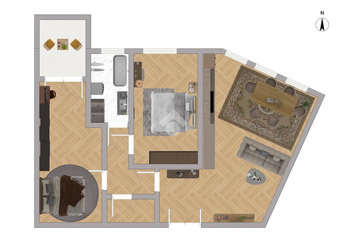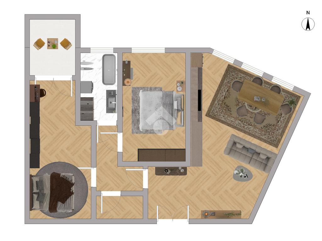 L’ingresso si apre su un’ampia zona giorno open space con cucina lineare e area pranzo, valorizzata da tre punti luce che rendono l’ambiente luminoso e accogliente. Il disimpegno conduce alla zona notte, dove trovano spazio un pratico ripostiglio, due camere da letto – di cui la matrimoniale con balcone – e un bagno finestrato dotato di doccia, vasca e predisposizione per lavatrice e asciugatrice in colonna.