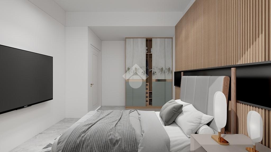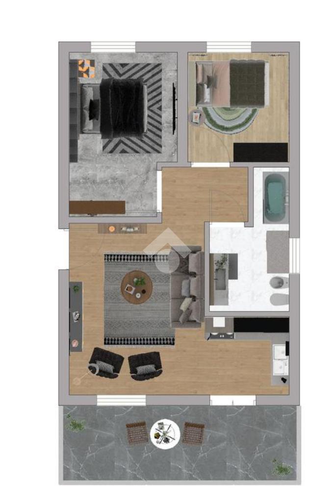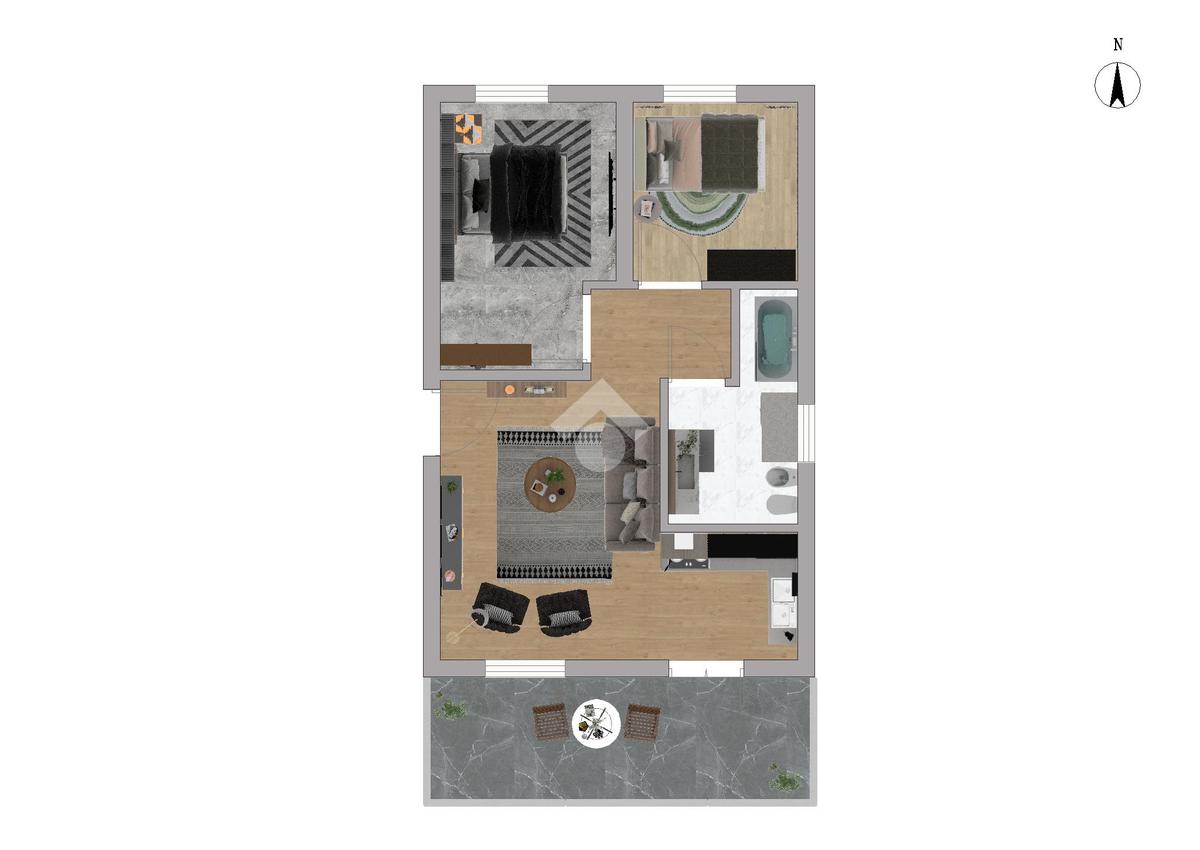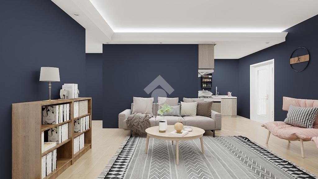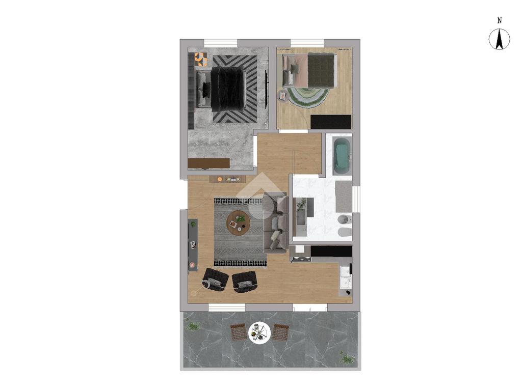L’ingresso conduce a un ampio open space con zona giorno e cucina a vista, che si apre su un balcone abitabile: uno spazio perfetto per momenti di relax all’aria aperta o per pranzi e cene all’aperto nella bella stagione.